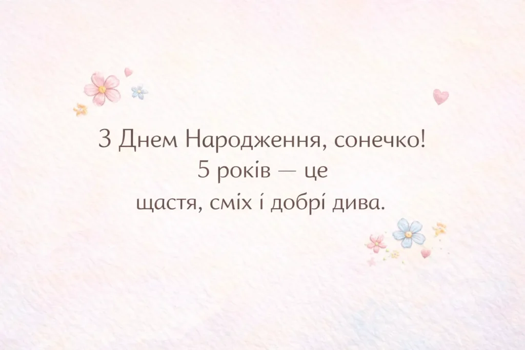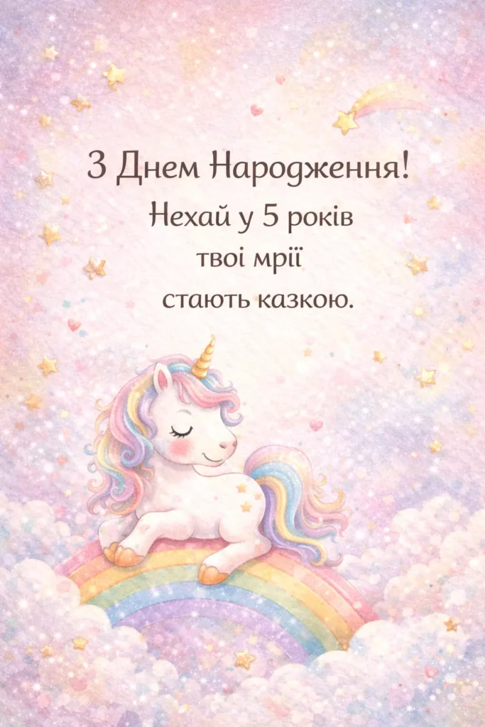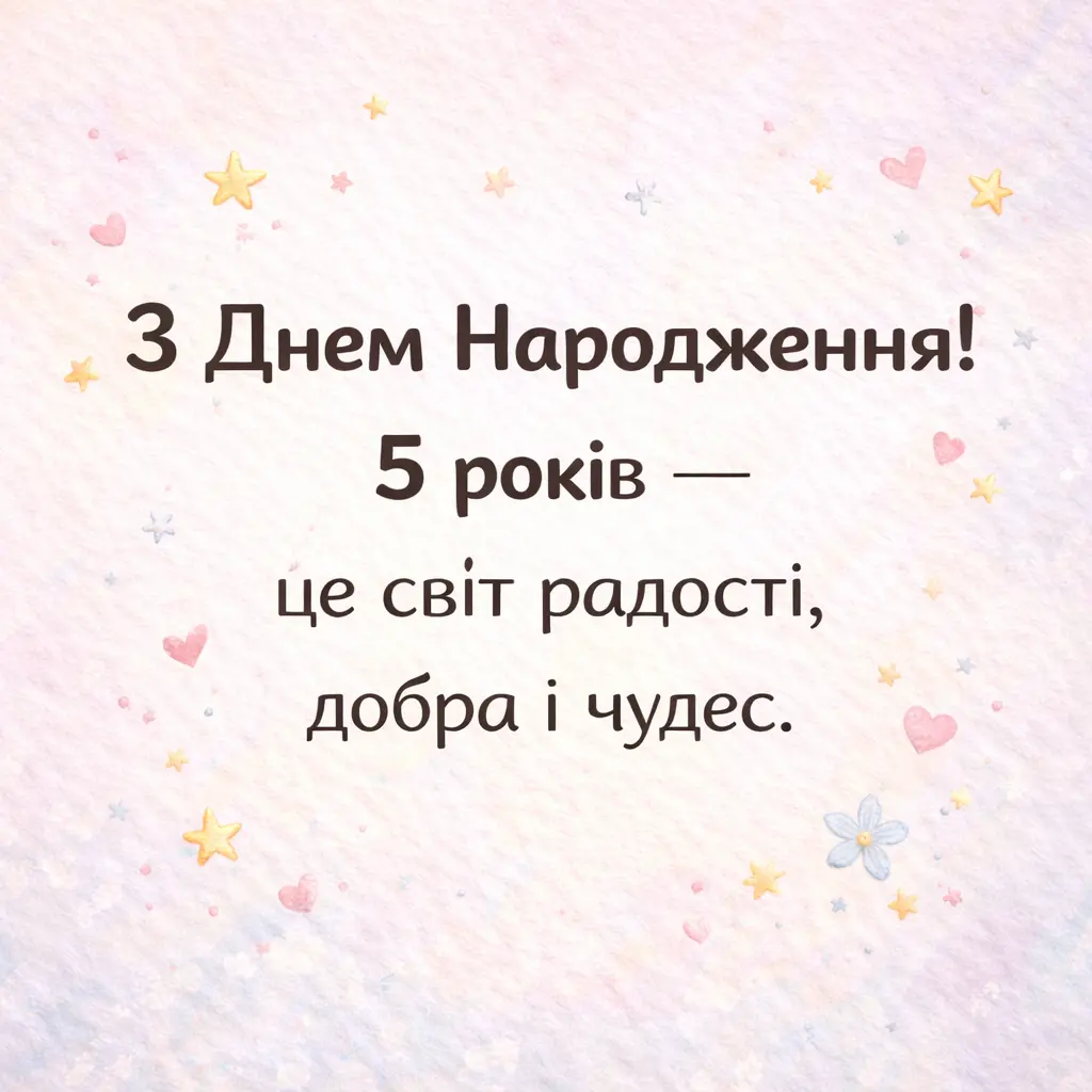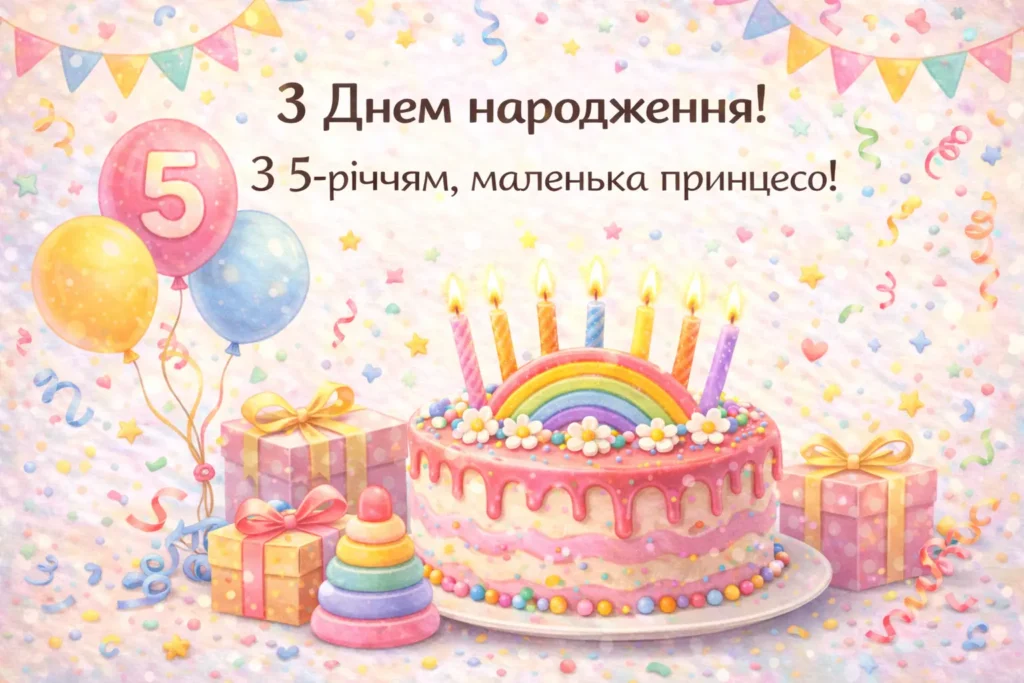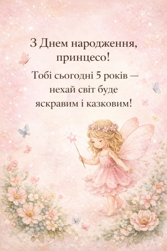З днем народження, маленька принцесо! Нехай тобі буде п’ять років радості, сміху та казкових чудес, а кожен день дарує нові усмішки.