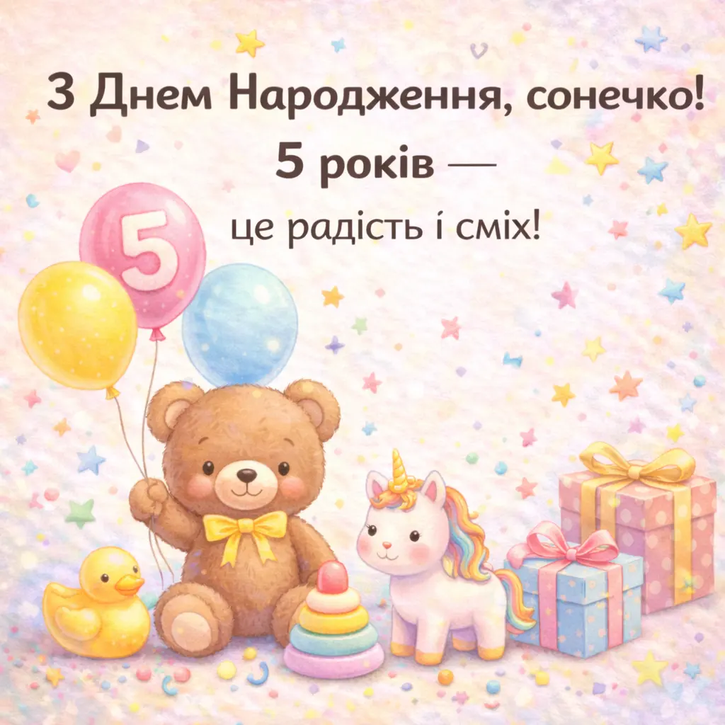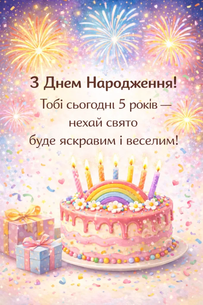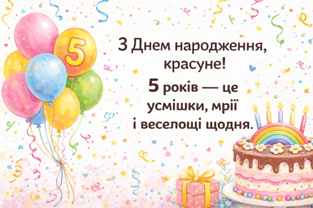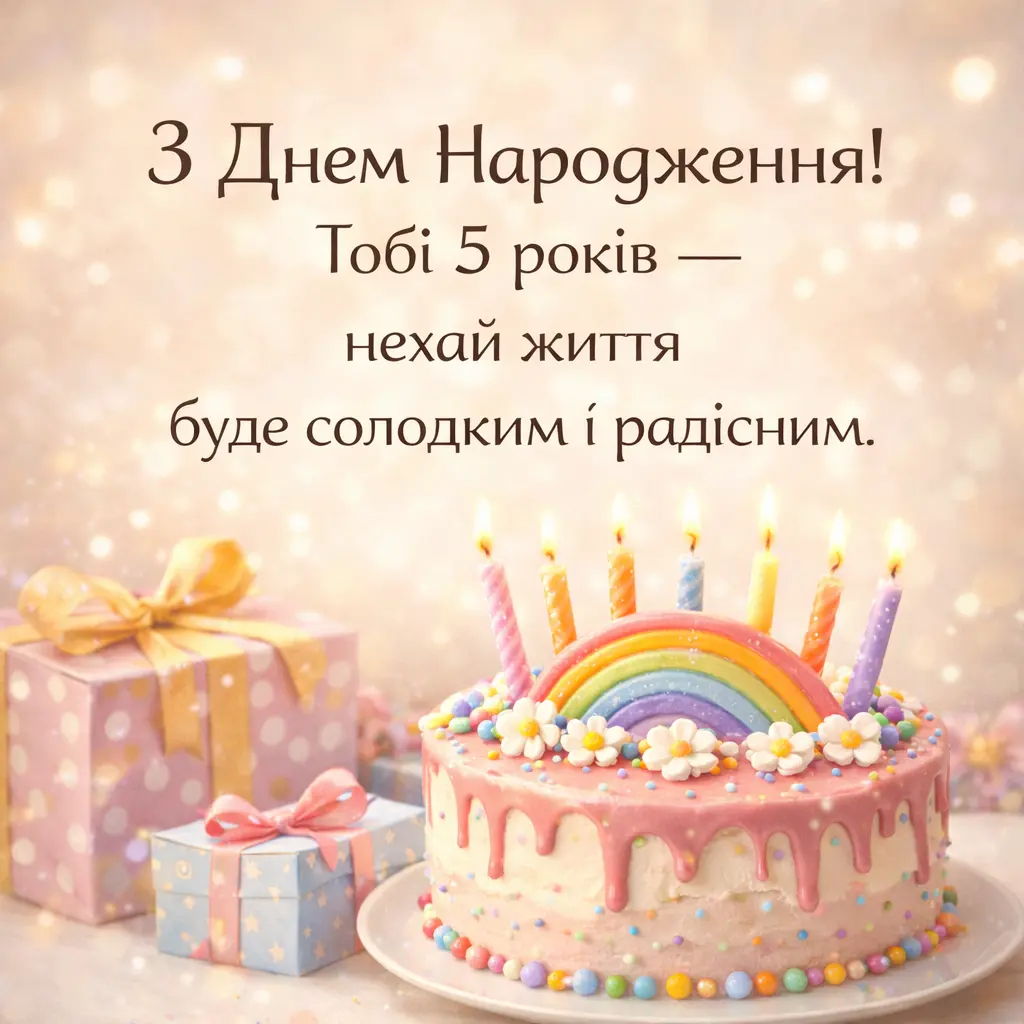 З днем народження, маленька принцесо! Нехай тобі буде п’ять років радості, сміху та казкових чудес, а кожен день дарує нові усмішки.